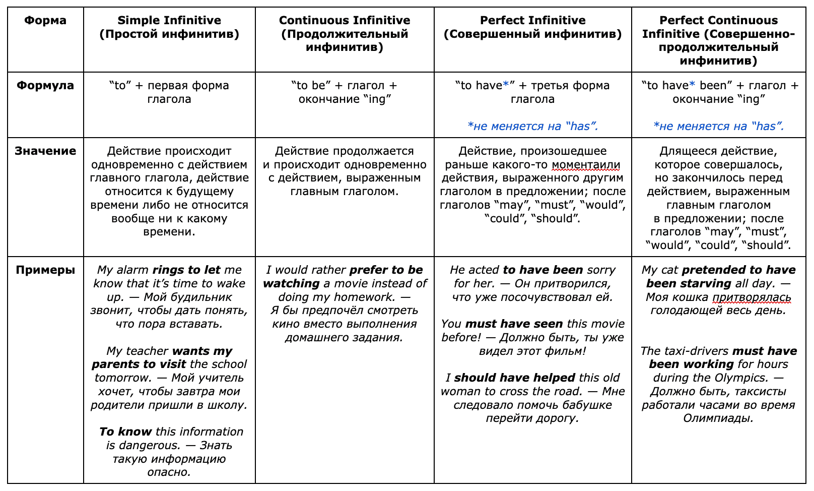 Четыре формы инфинитива: таблица