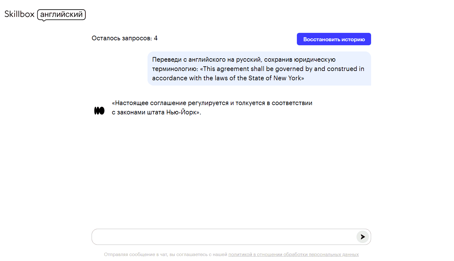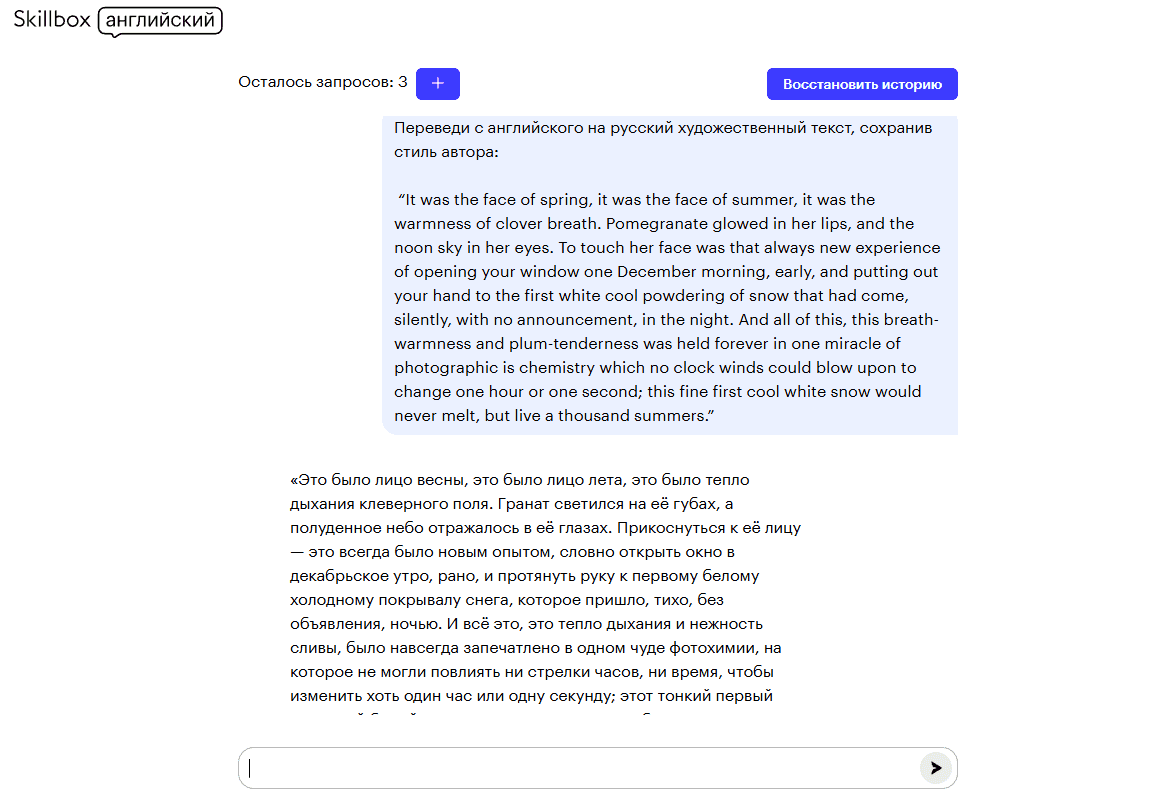 На нашей платформе каждый пользователь может отправить в ИИ-чат пять запросов — если вы потратите лимит, он обновится через несколько часов, и вы сможете продолжить работу. Поэтому если вам нужно сразу получить качественный перевод с английского или на английский, формулируйте промпты максимально точно и ёмко. Как это сделать?