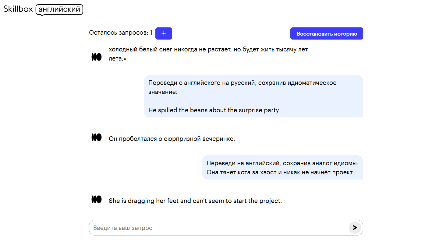 Нейросети способны распознавать и корректно переводить идиомы, что делает их особенно полезными при работе с неформальными текстами или разговорной речью. Или если вам нужно перевести художественный текст. При этом вы можете попросить нейросеть просто передать значение идиомы или подобрать её аналог на языке перевода.
