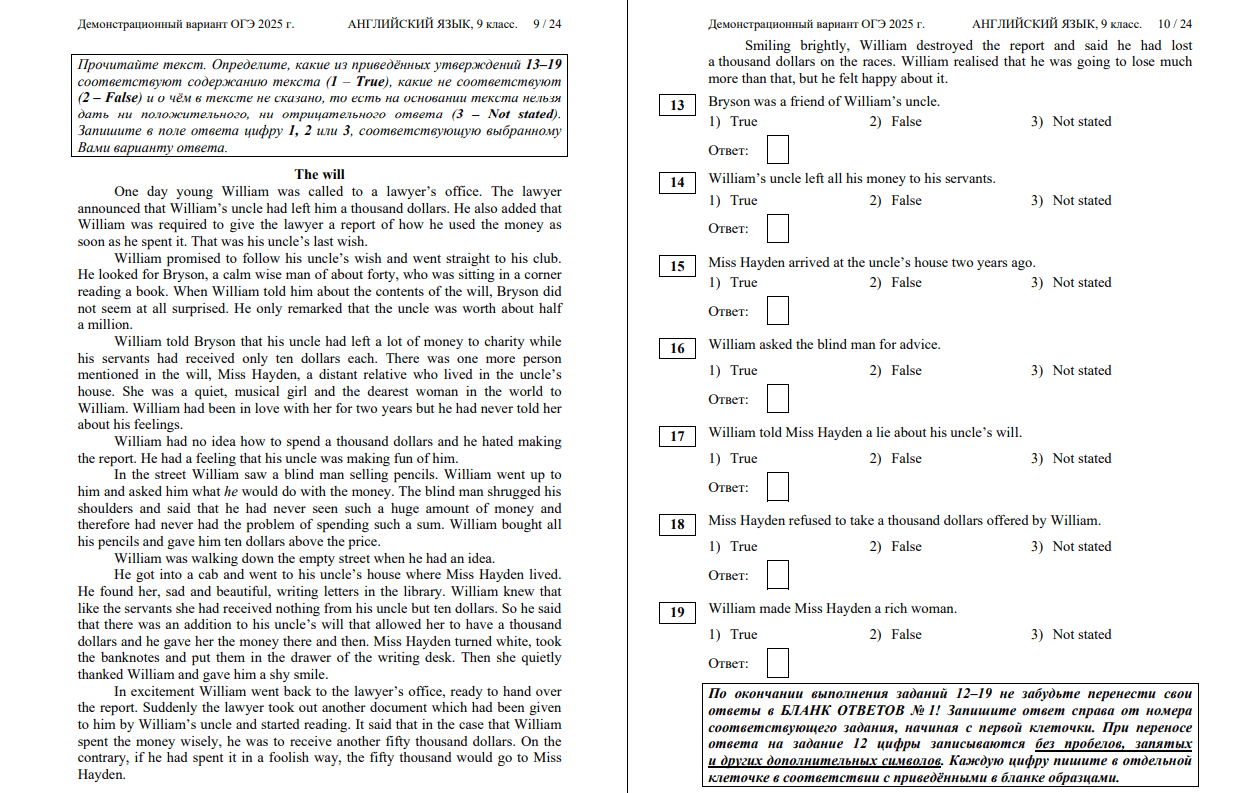 Далее ученик переходит ко второму тексту — после него следуют задания 13–19. Каждое задание — одно утверждение. Требуется определить, правдиво оно, ложно или информации из текста недостаточно, чтобы сделать однозначный вывод.